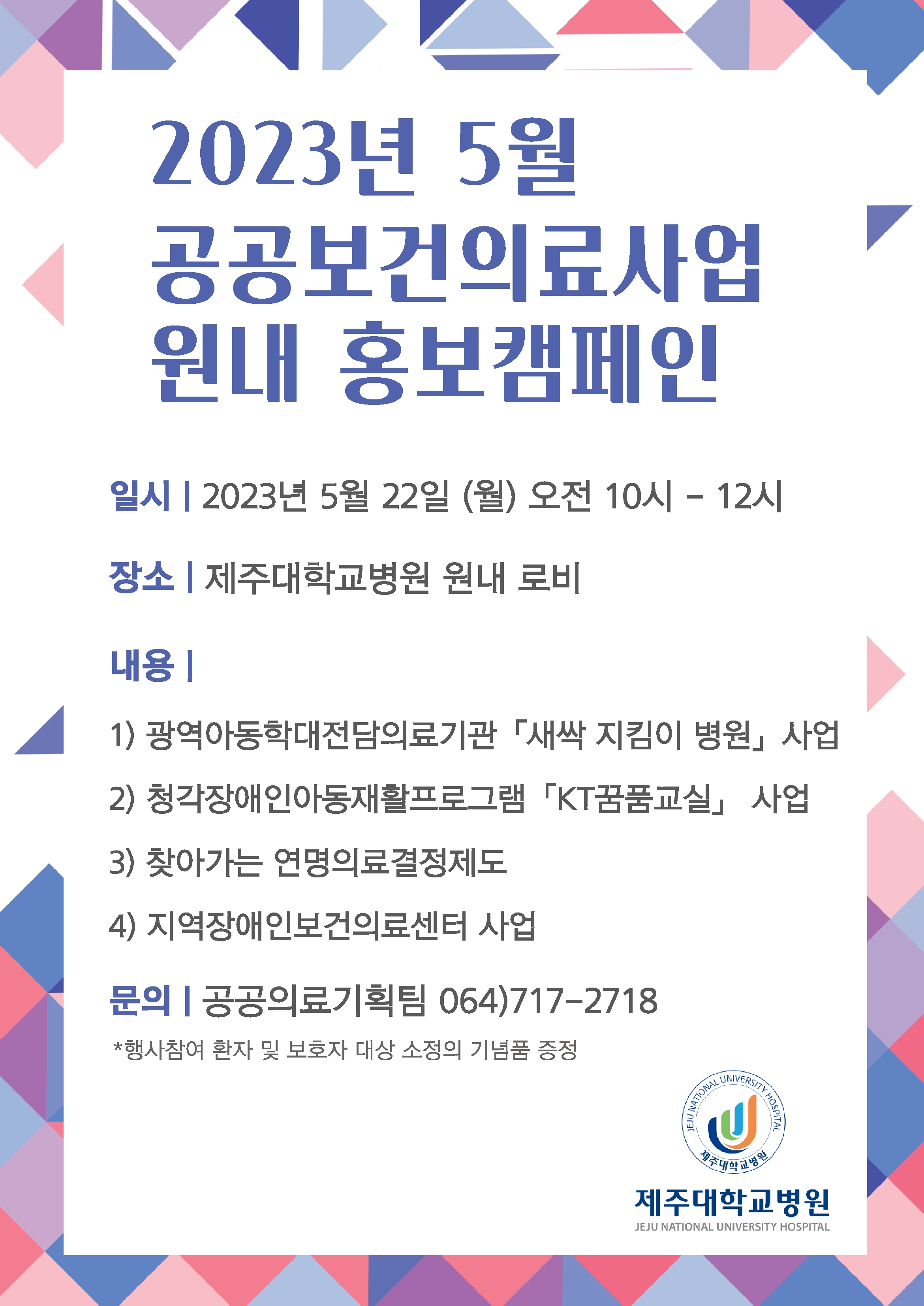 | 5 | 공공보건의료사업 원내 홍보 캠페인 | 2023.06.29 | 2023-07-24 ~ 2023-07-24 | 기관관리자 |